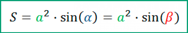 Также площадь ромба равна произведению квадрата его стороны на синус любого угла. Формула площади ромба через сторону и угол S имеет следующий вид: