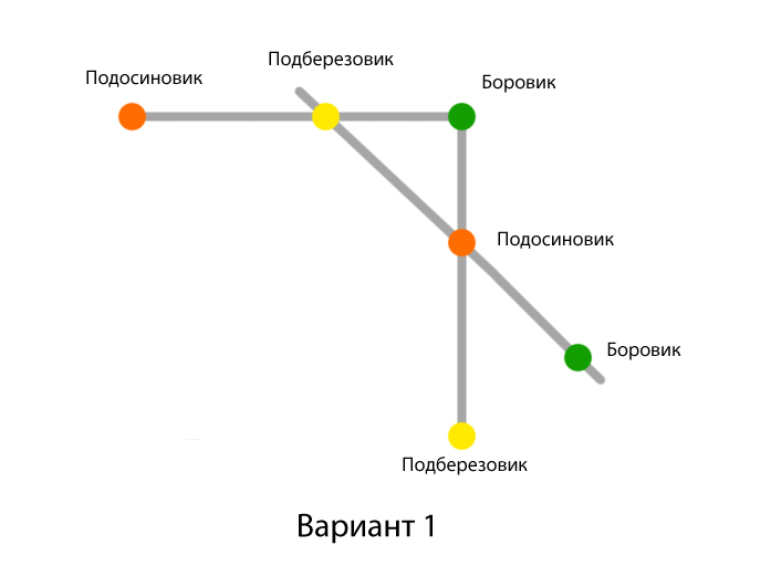 Необходимо нарисовать треугольник, в каждую вершину которого поместить грибы: боровик, подберезовик и подосиновик. Три гриба расставлены, поэтому необходимо разместить еще три. Между каждыми двумя грибами в вершинах треугольника поместить по одному отличному от этих двух грибу: между боровик и подберезовиком размещаем подосиновик, между подосиновиком и подберезовиком размещаем боровик и т. д.