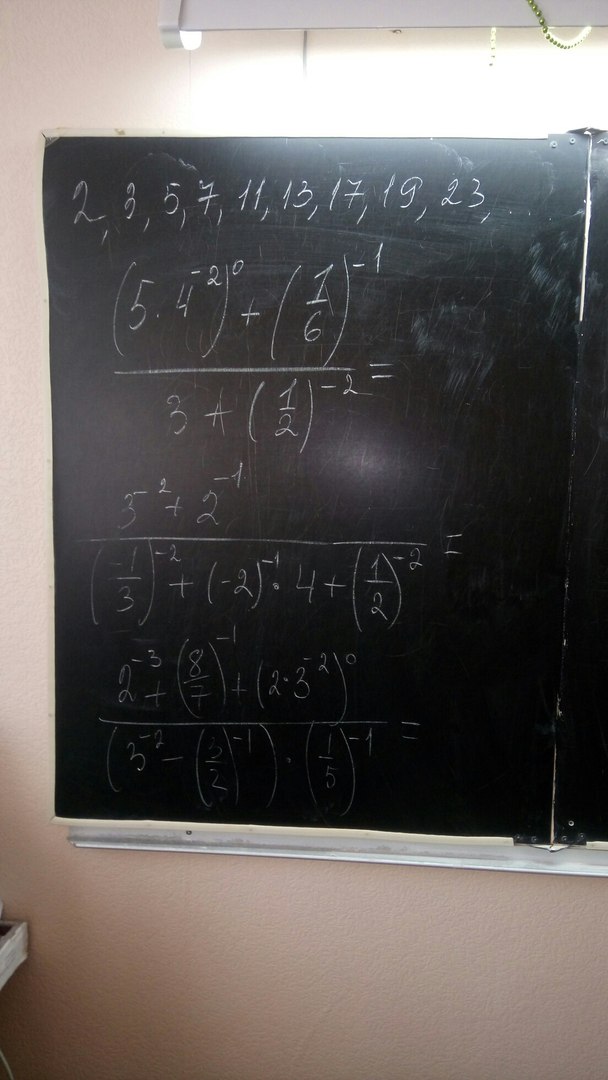 1) ((5 * 4⁻²)⁰ + (1/6)⁻¹) / 3 + (1/2)⁻² = 0 + 6 / 3 + 4 = 6/7