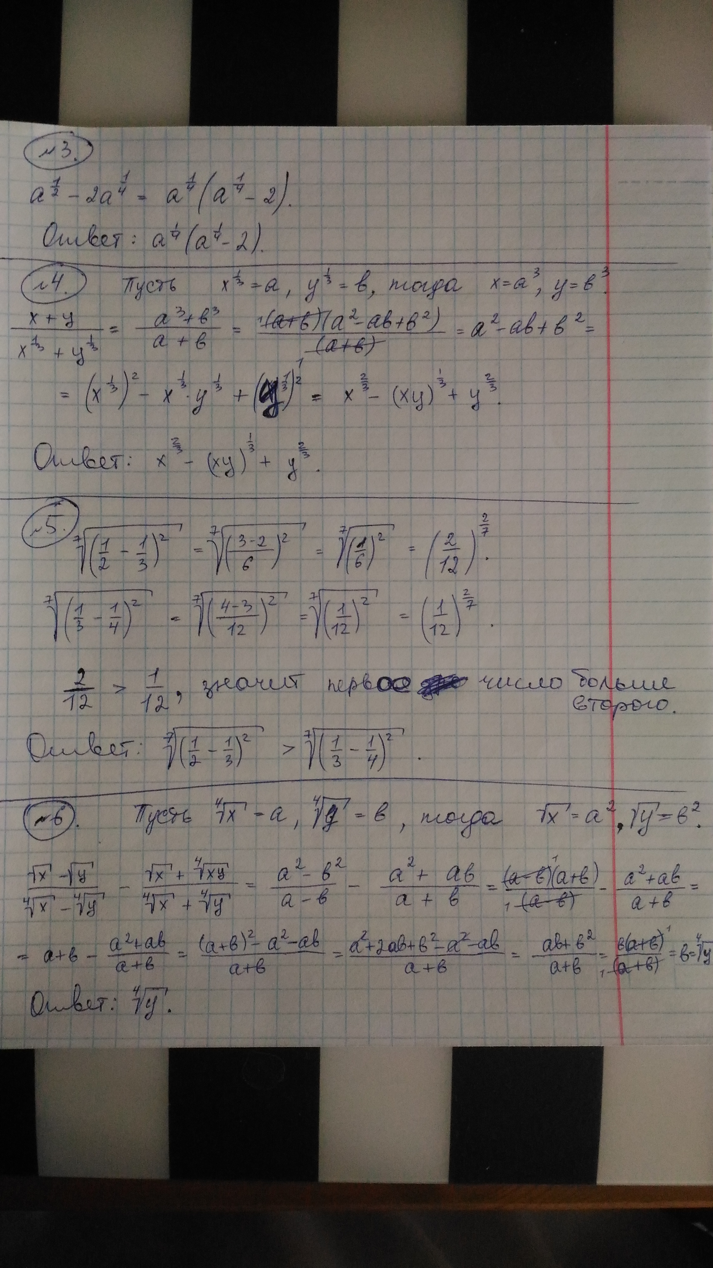 $\frac{x^{\frac{1}{2}}-y^{\frac{2}{3}}}{x^{\frac{1}{4}}+y^{\frac{1}{3}}}+y^{\frac{1}{3}}=