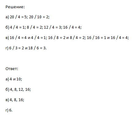 а) 20 / 4 = 5; 20 / 10 = 2;