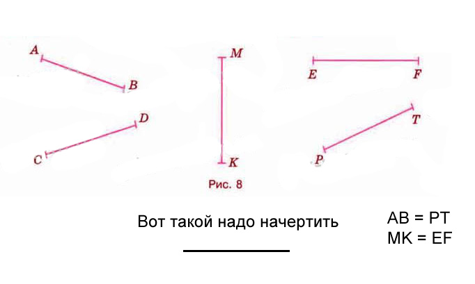 При помощи циркуля найди одинаковые отрезки на рисунке 8. Постройте в тетради отрезок, равный отрезку EF.