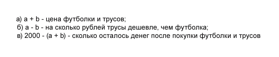 в) 2000 - (а + b) - сколько осталось денег после покупки футболки и трусов