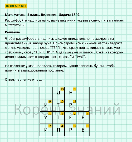 Чтобы расшифровать надпись следует внимательно посмотреть на представленный набор букв. Присмотревшись к нижней части квадрата можно увидеть часть слова "ТЕРП", что сразу подталкивает к часто употребимому слову "ТЕРПЕНИЕ". А дальше уже остается 5 букв, из которых легко складывается вторая часть фразы "И ТРУД".