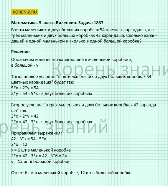 Тогда первое условие "в пяти маленьких и двух больших коробках 54 цветных карандаша" будет так: