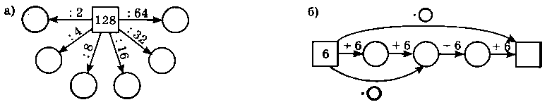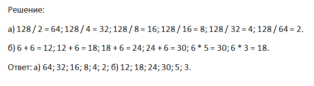 Ответ: а) 64; 32; 16; 8; 4; 2; б) 12; 18; 24; 30; 5; 3.