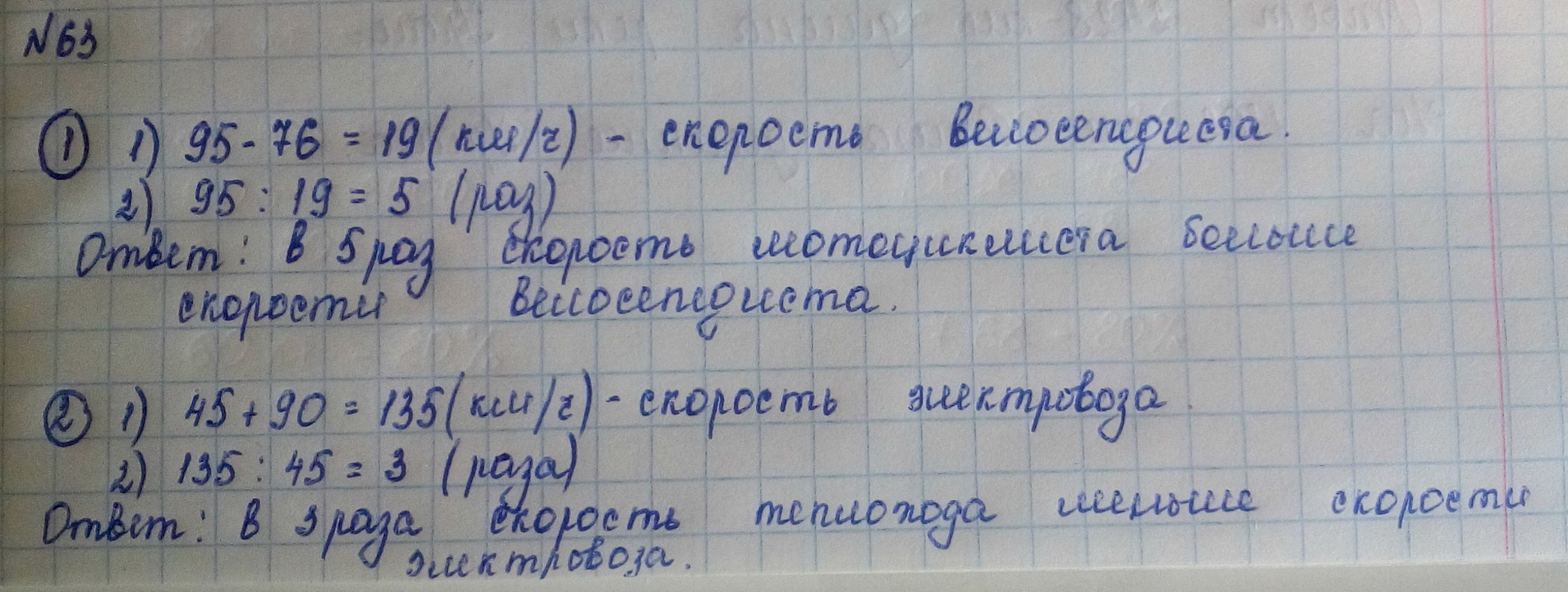 1) Мотоциклист едет по трассе со скоростью 95 км/ч, а скорость велосипедиста на 76 км/ч меньше. Во сколько раз скорость мотоциклиста больше скорости велосипедиста?