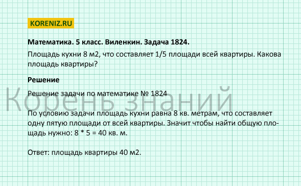 По условию задачи площадь кухни равна 8 кв. метрам, что составляет одну пятую площади от всей квартиры. Значит чтобы найти общую площадь нужно: 8 * 5 = 40 кв. м.
