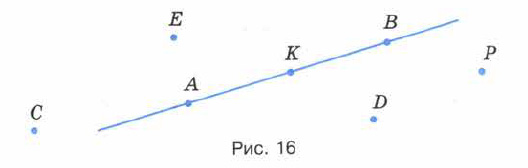Точки A, K, B лежат на прямой AB, а точки C, D, E, P не лежат на прямой AB.