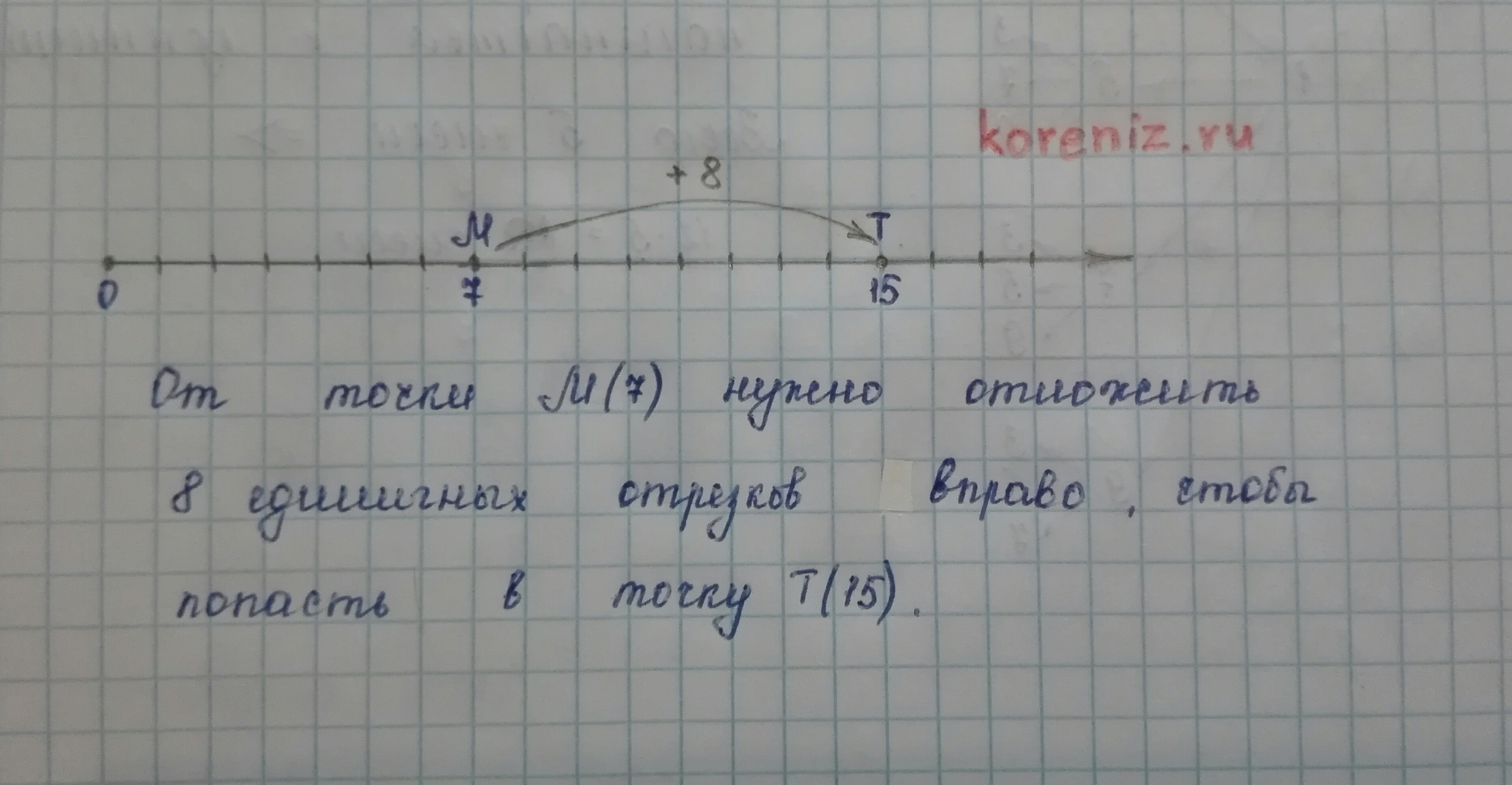 Начертите луч и отметь на нем точки M(7) и T(15). Сколько отрезков нужно отложить от точки M и в какую сторону, чтобы попасть в точку T?