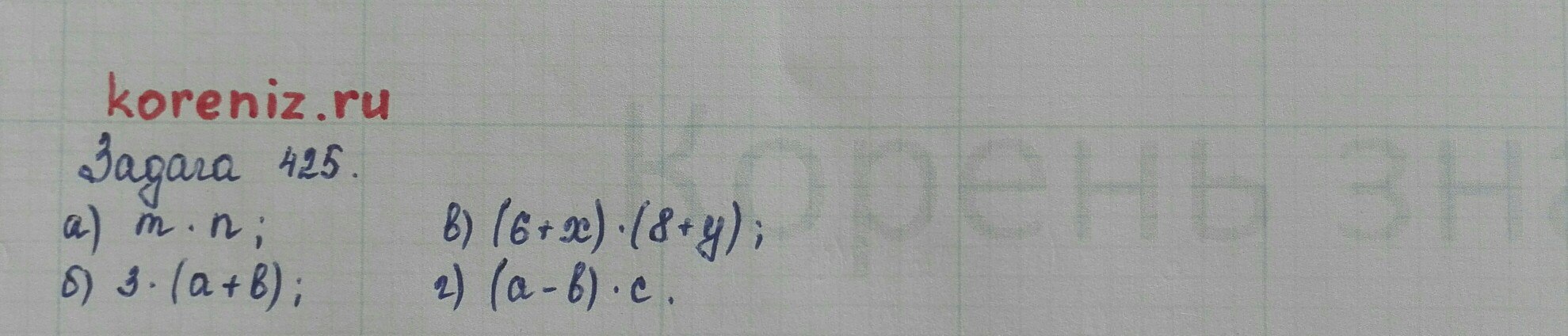 razor Отличник 2017-08-15 12:31:34 Задача по математике 5 класс № 425 а) m * n; б) 3 * (a + b); в) (6 + x) * (8 + y); г) (a - b) * c. 0 комментариев Отметить нарушение! Спасибо 0 Отправить Войти чтобы добавить комментарий